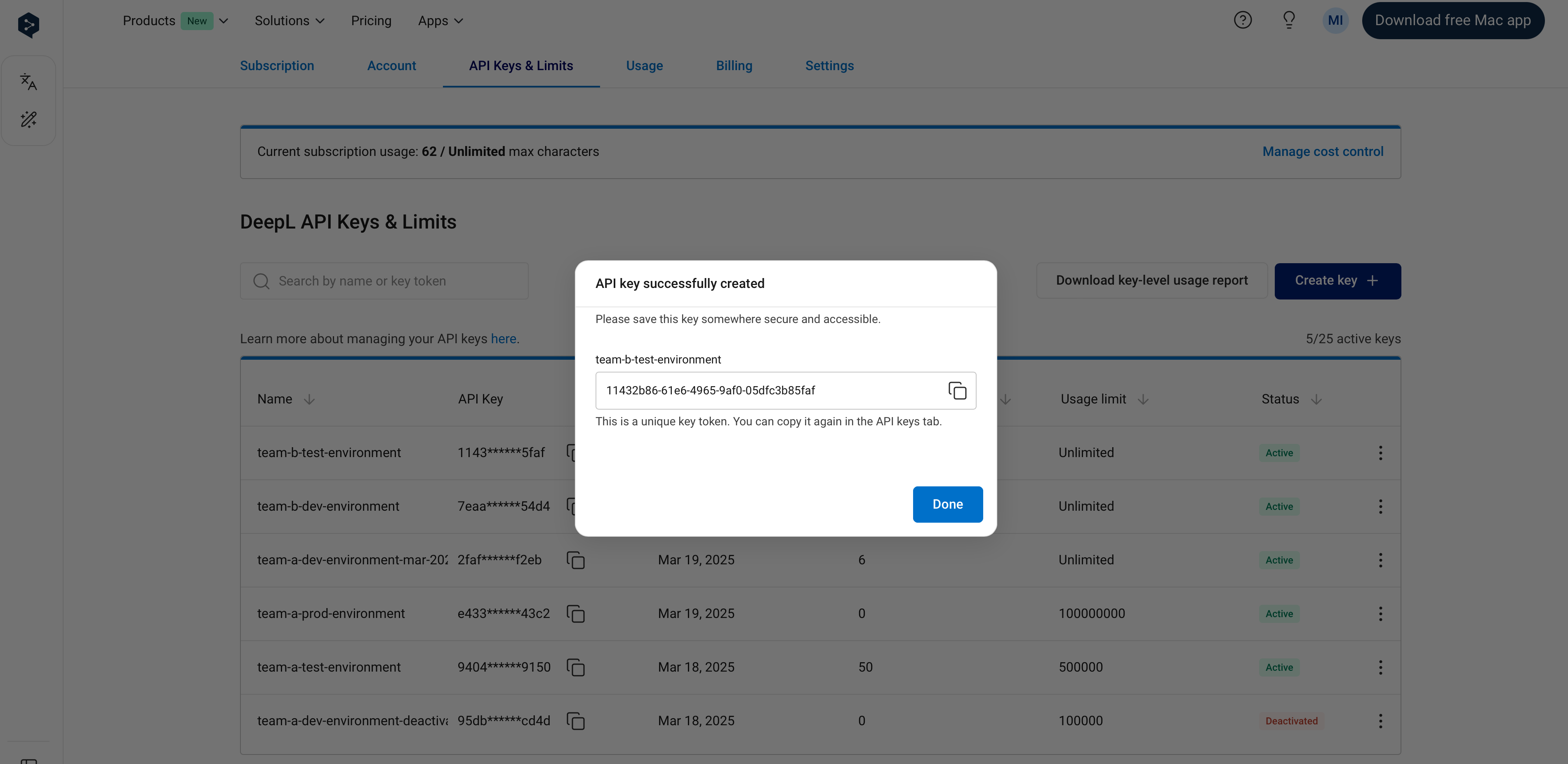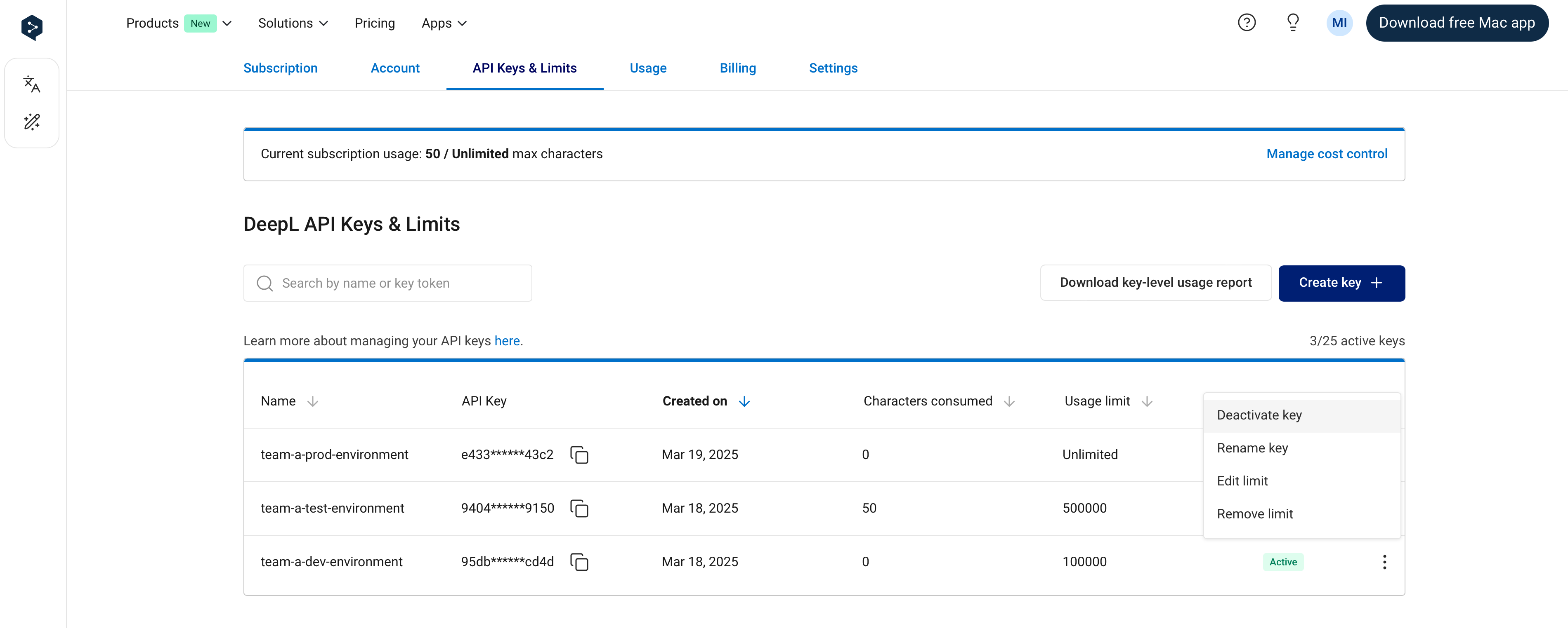 You can find and manage your API keys in the “API Keys & Limits” tab when signed into your DeepL API account. It’s possible to create multiple, simultaneously active API keys in a single API subscription.